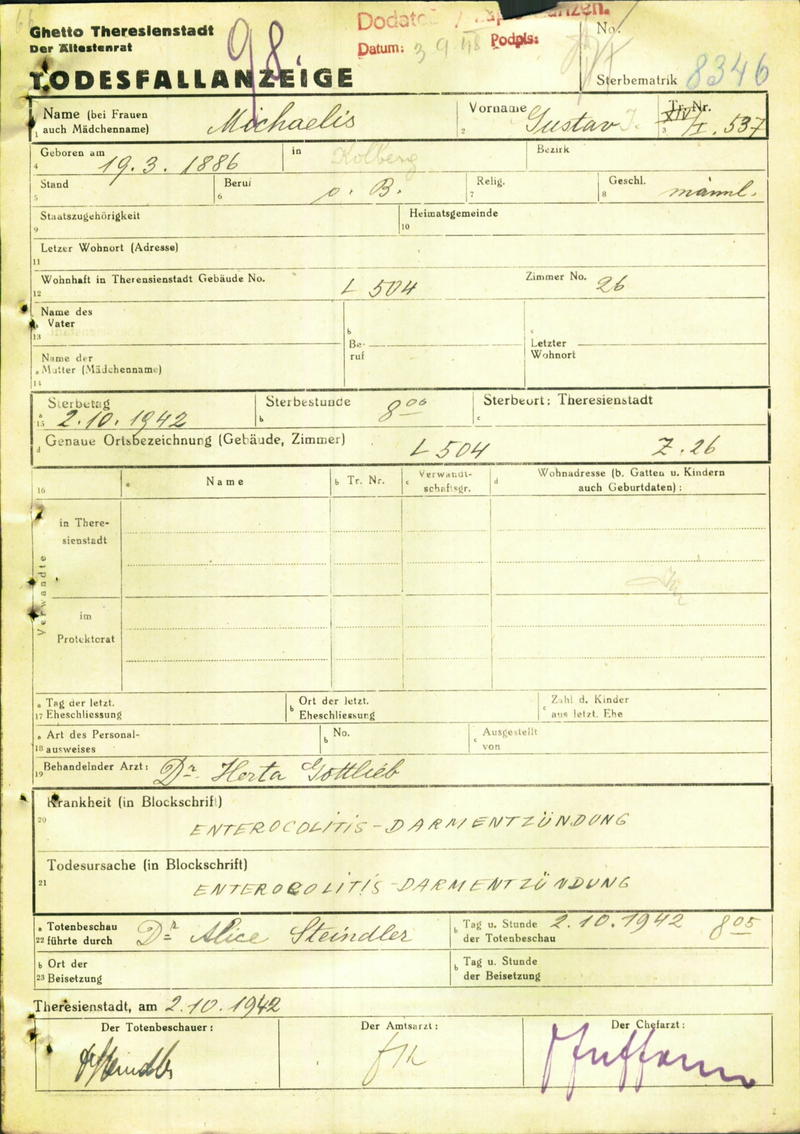 Michaelis Gustav: Todesfallanzeige, Ghetto Theresienstadt