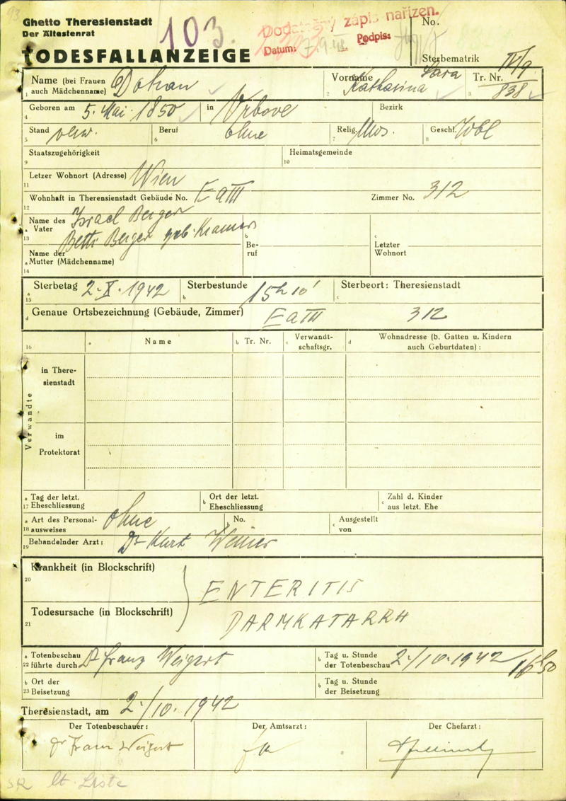 Dohan Katharina: Todesfallanzeige, Ghetto Theresienstadt