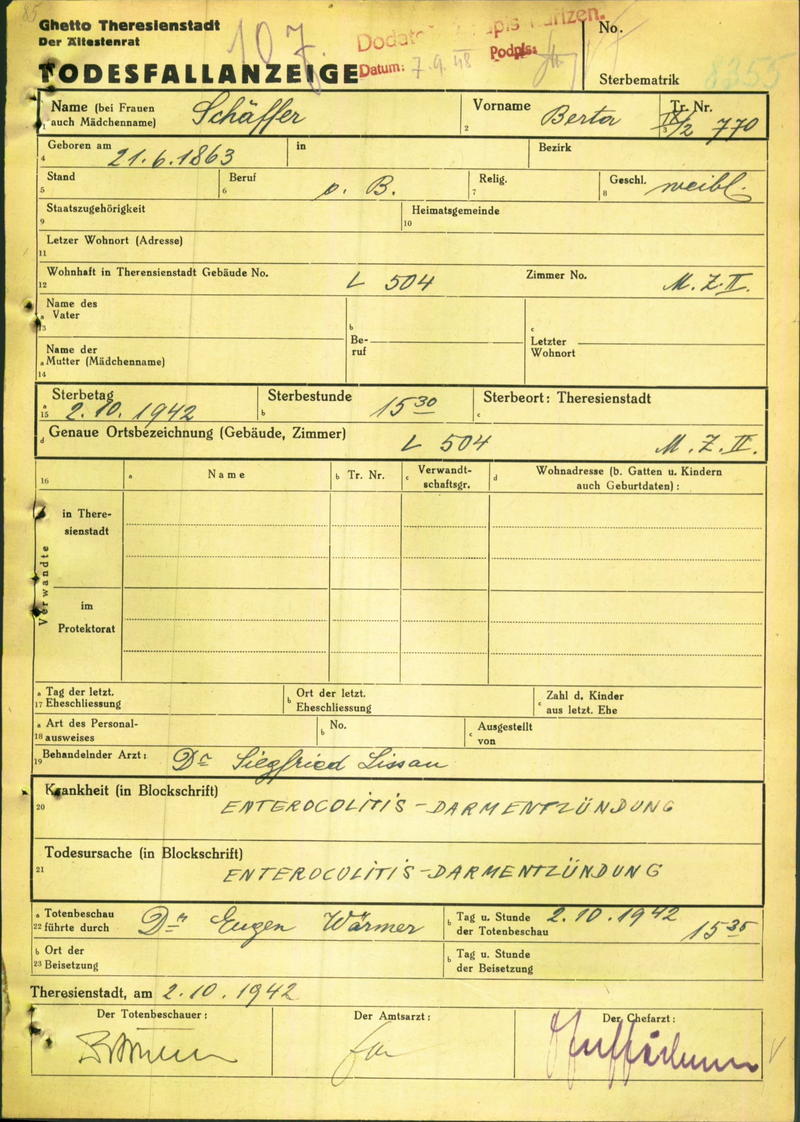 Schäffer Berta: Todesfallanzeige, Ghetto Theresienstadt