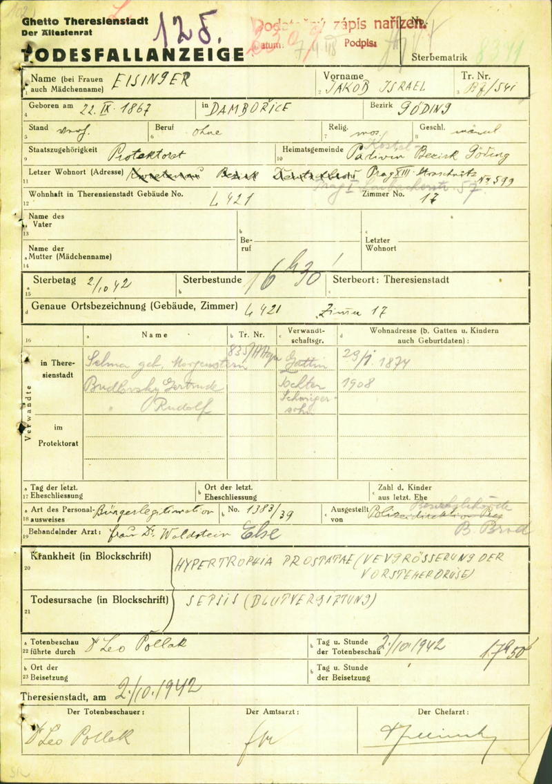 Eisinger Jakob: Todesfallanzeige, Ghetto Theresienstadt