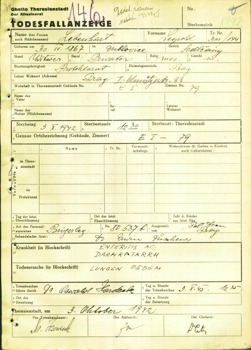 Lebenhart Leopold: Todesfallanzeige, Ghetto Theresienstadt
