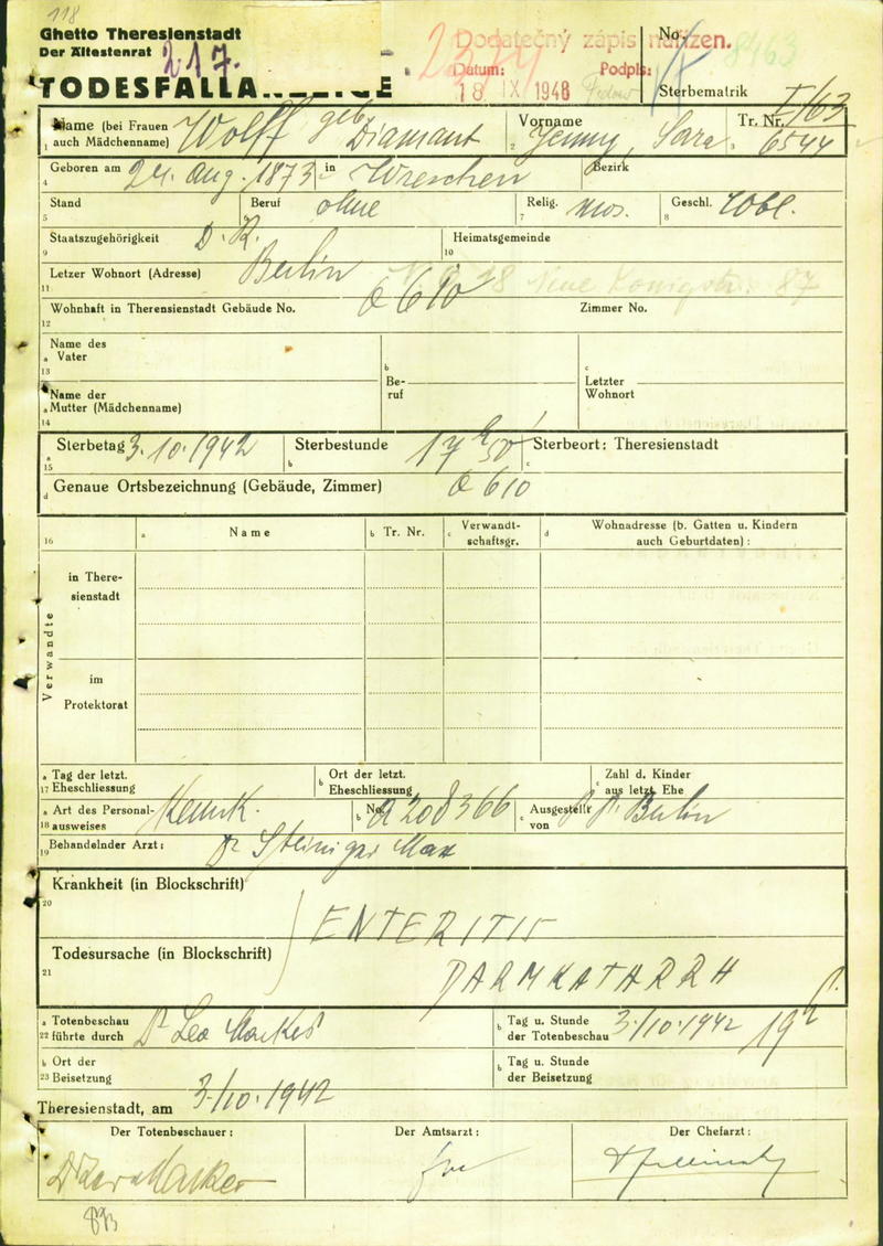 Wolff Jenny: Todesfallanzeige, Ghetto Theresienstadt