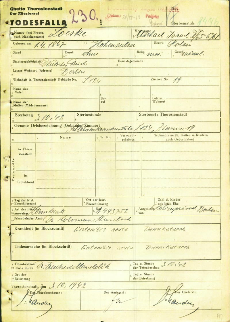 Löske Michael: Todesfallanzeige, Ghetto Theresienstadt