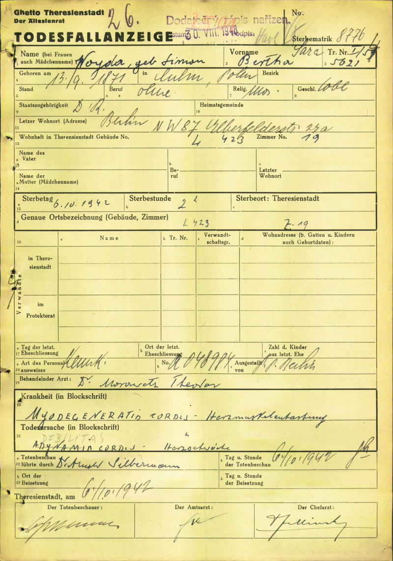 Woyda Bertha: Todesfallanzeige, Ghetto Theresienstadt