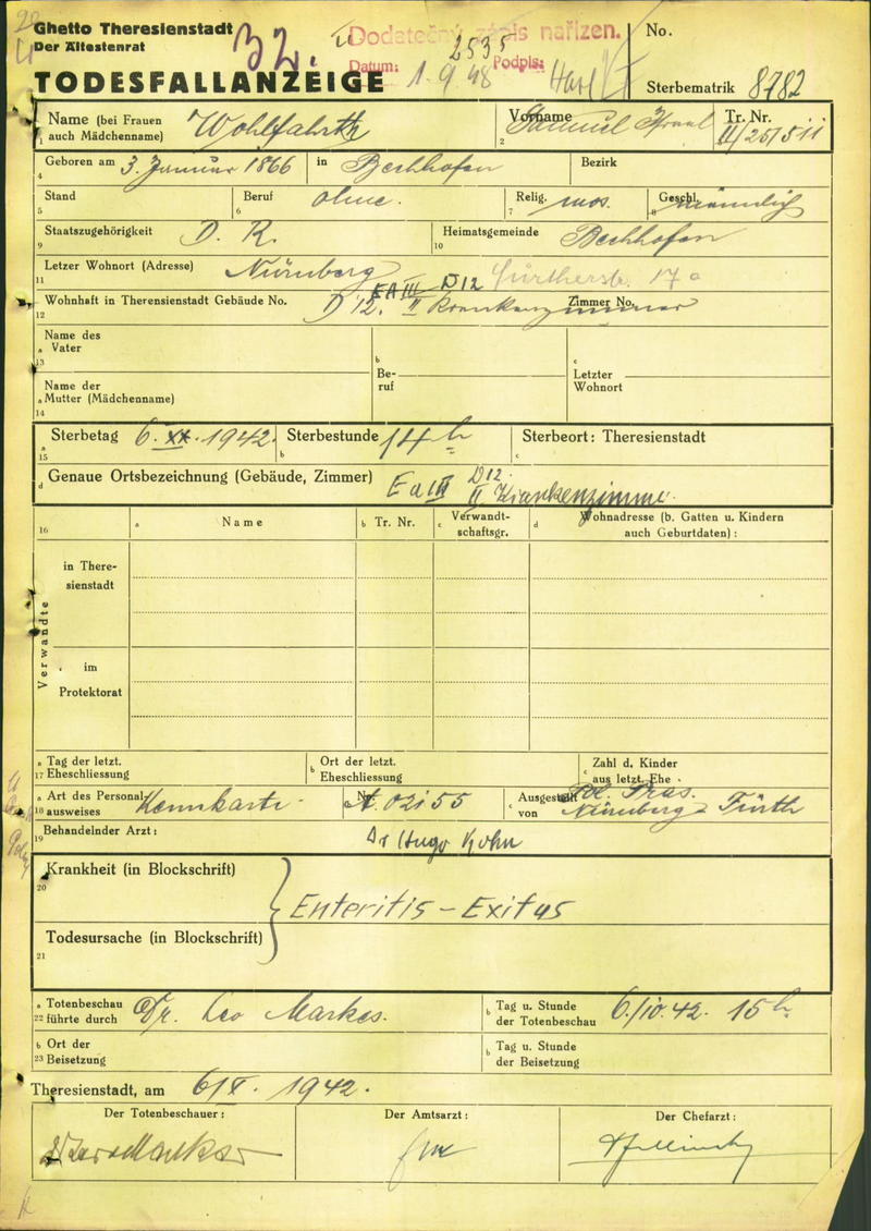Wohlfahrt Samuel: Todesfallanzeige, Ghetto Theresienstadt