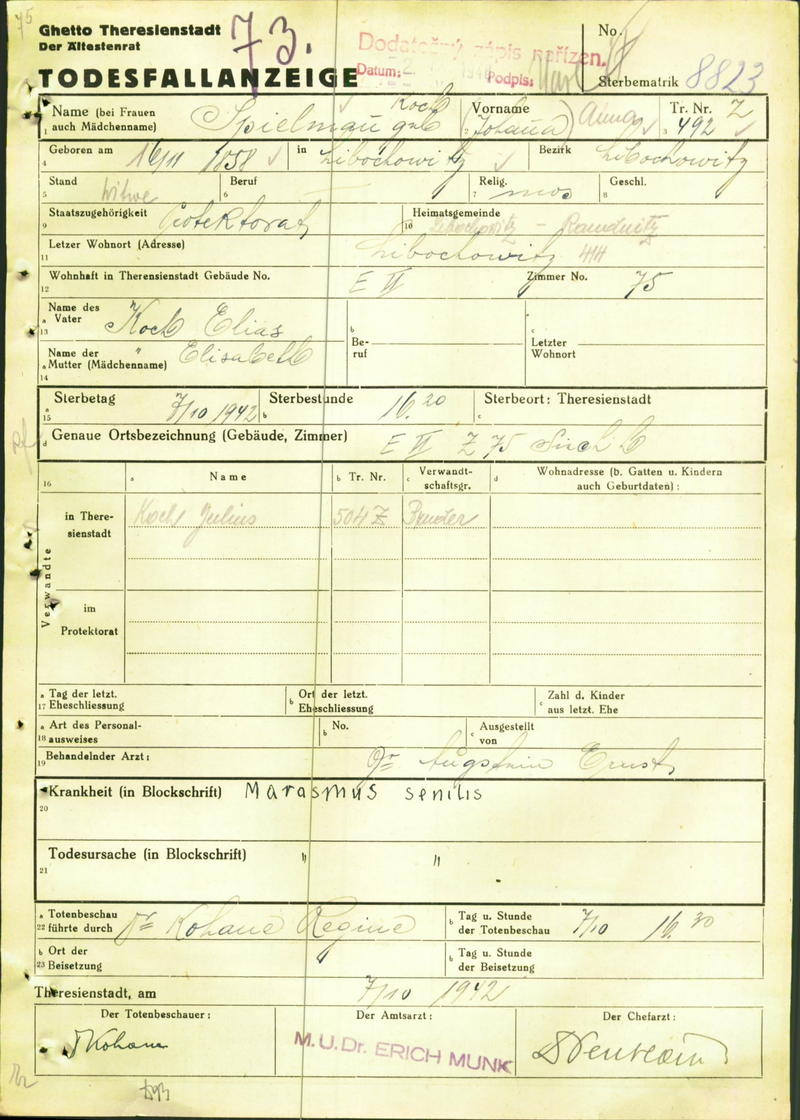 Spielmannová Jana: Todesfallanzeige, Ghetto Theresienstadt