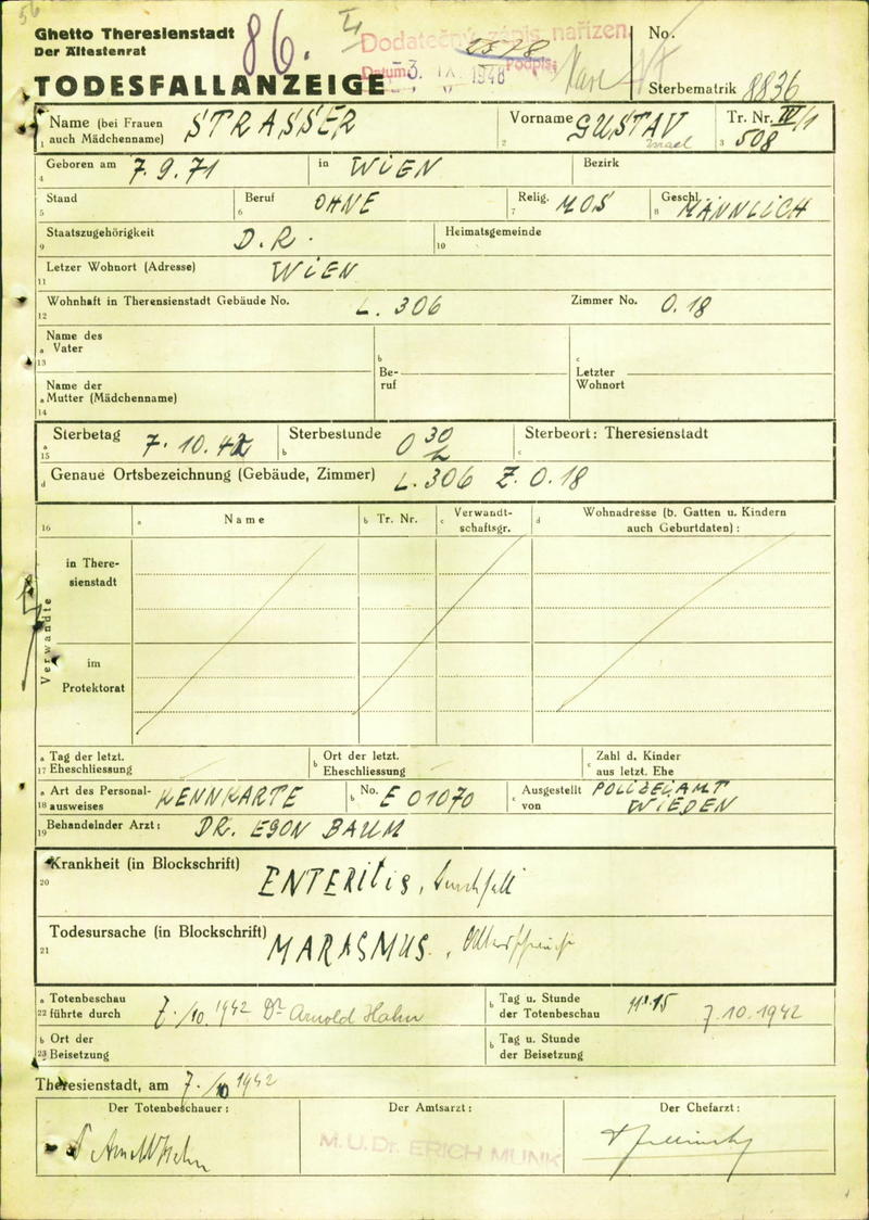 Strasser Gustav: Todesfallanzeige, Ghetto Theresienstadt