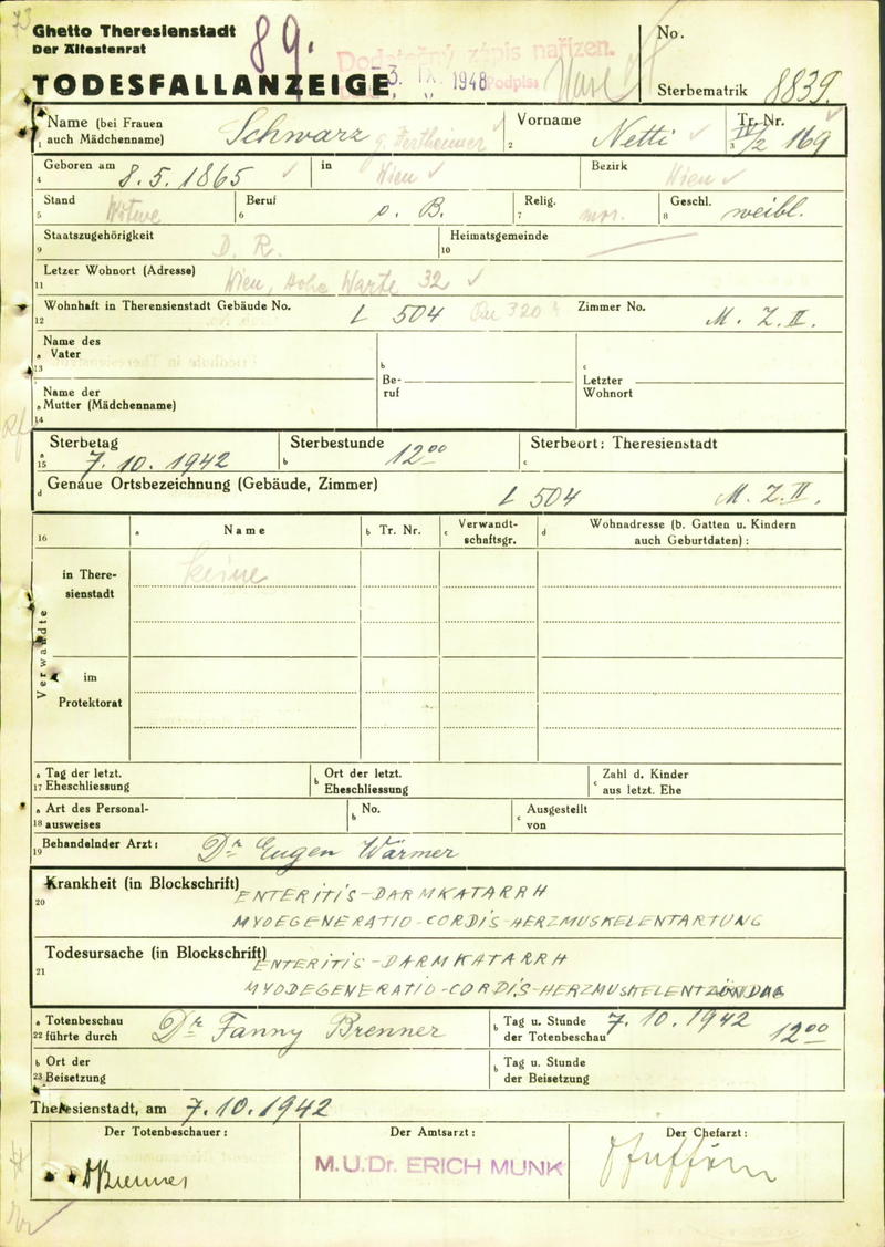 Schwarz Betti: Todesfallanzeige, Ghetto Theresienstadt