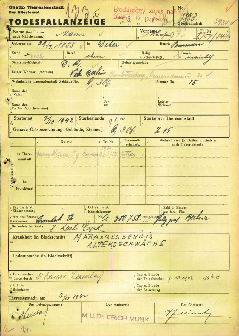 Mann Moses: Todesfallanzeige, Ghetto Theresienstadt