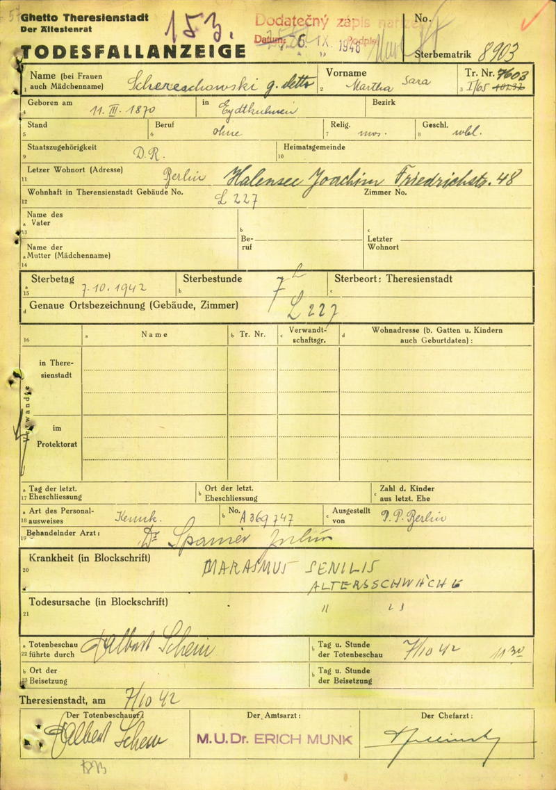 Schereschewski Martha: Todesfallanzeige, Ghetto Theresienstadt