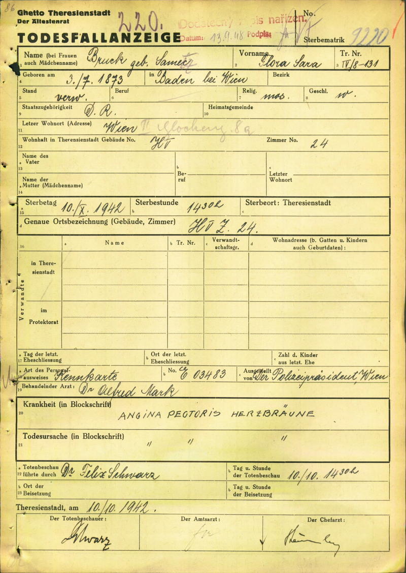 Bruck Flora: Todesfallanzeige, Ghetto Theresienstadt