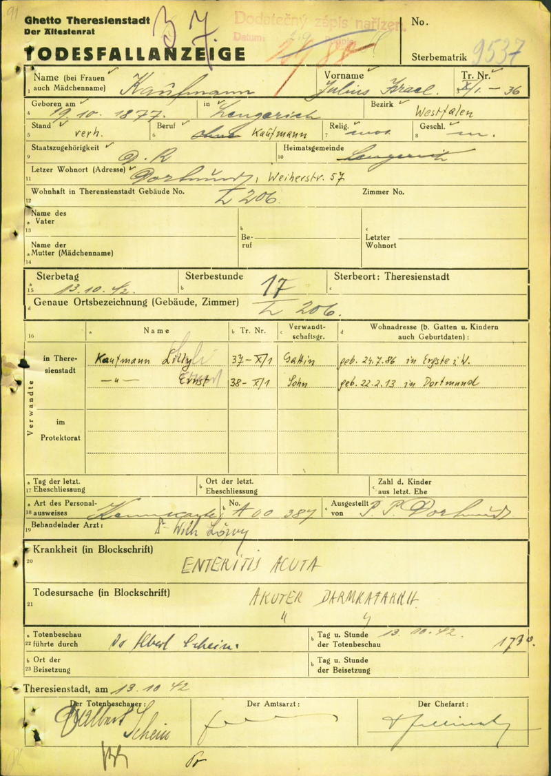 Kaufmann Julius: Todesfallanzeige, Ghetto Theresienstadt