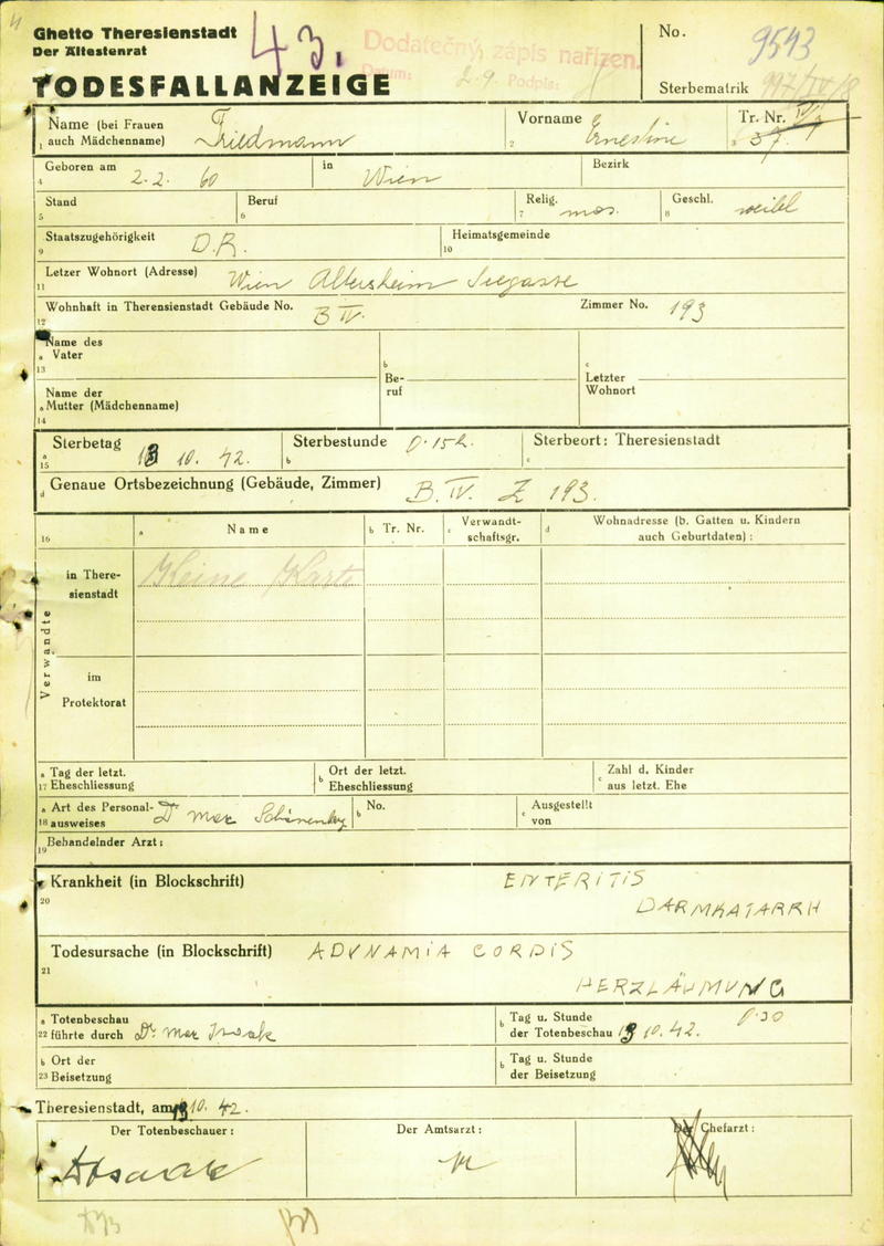 Friedmann Ernestine: Todesfallanzeige, Ghetto Theresienstadt