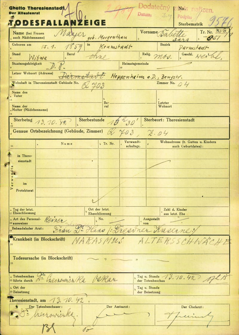 Mayer Babette: Todesfallanzeige, Ghetto Theresienstadt