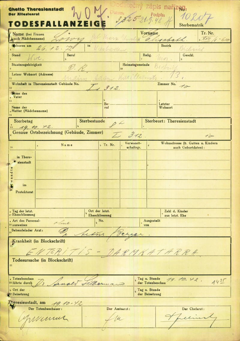 Löwy Elisabeth: Todesfallanzeige, Ghetto Theresienstadt