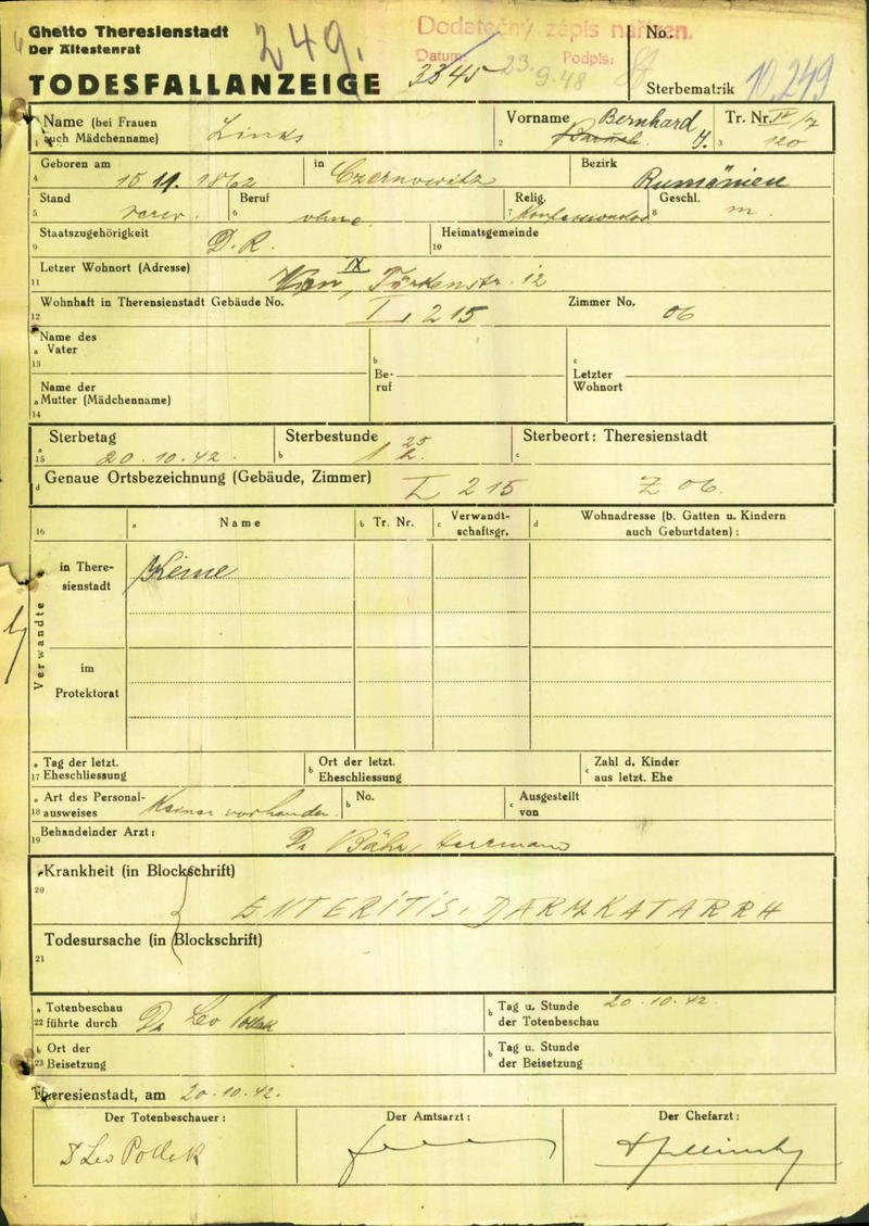 Links Baruch Bernhard: Todesfallanzeige, Ghetto Theresienstadt