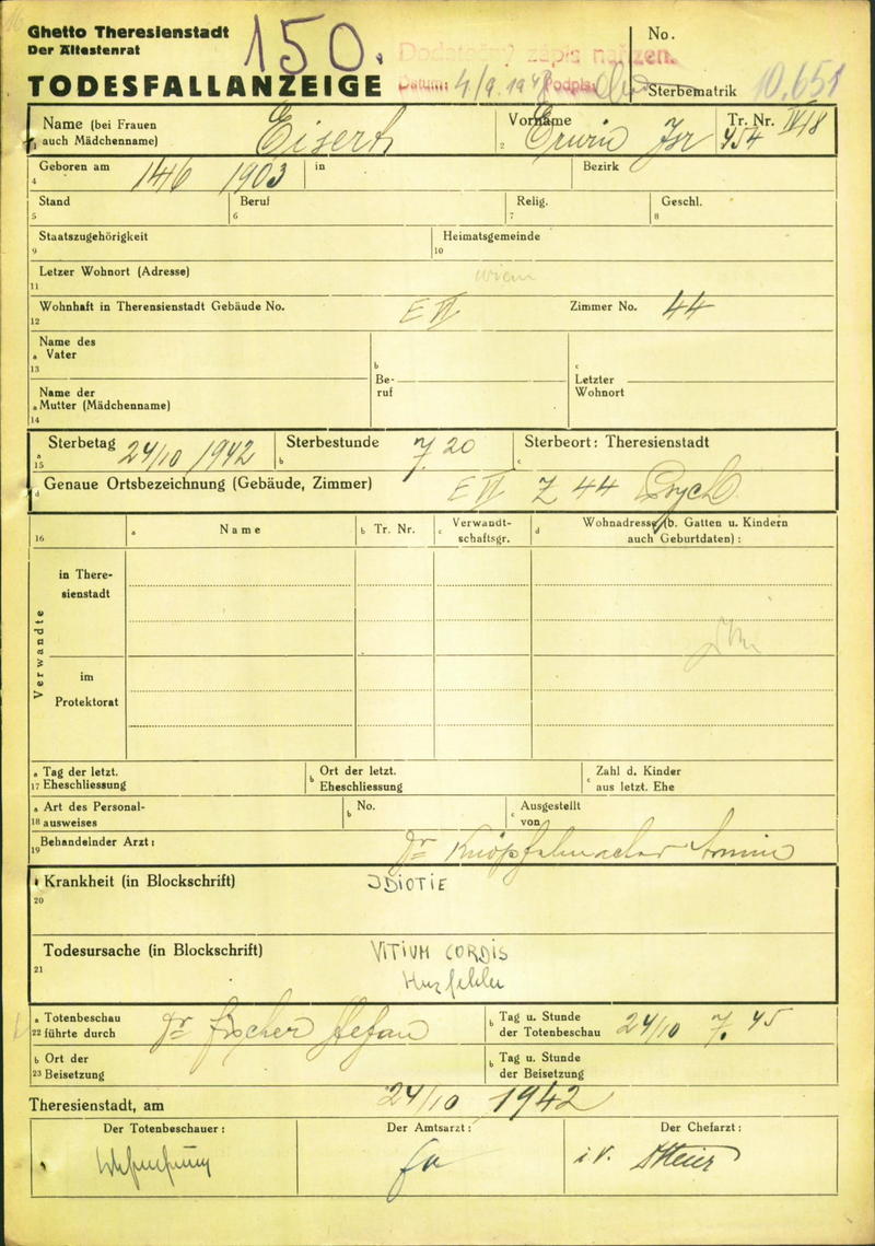 Eisert Erwin: Todesfallanzeige, Ghetto Theresienstadt