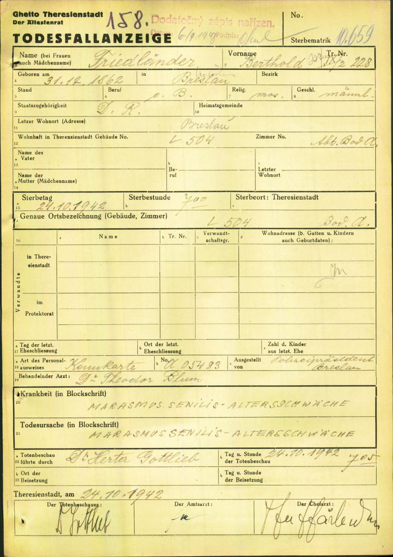 Friedländer Berthold: Todesfallanzeige, Ghetto Theresienstadt