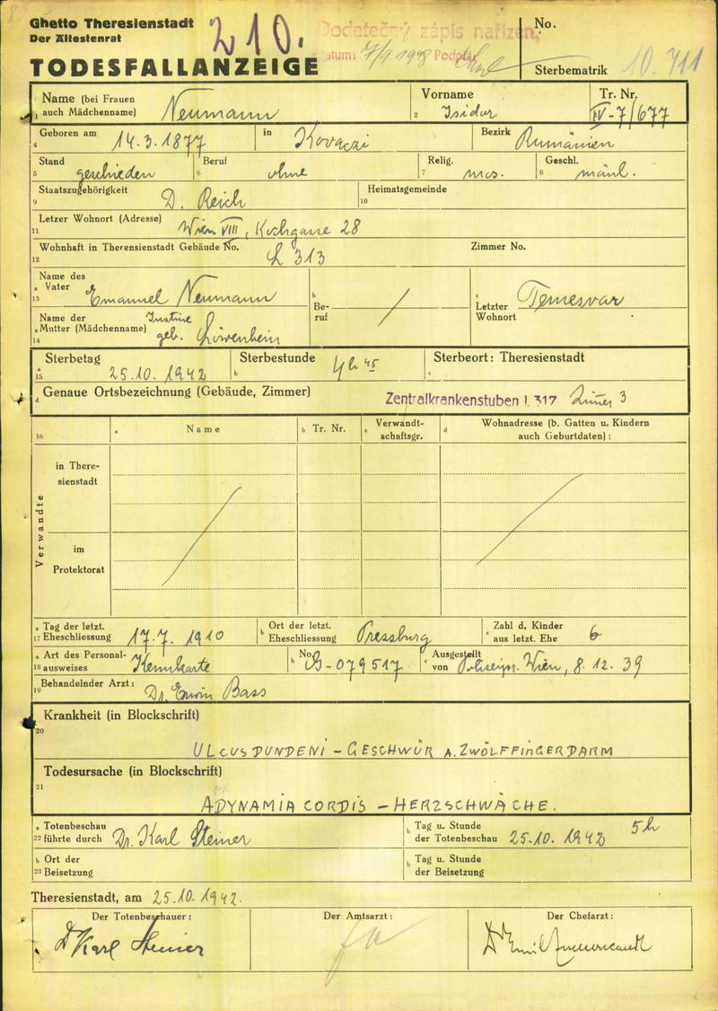 Neumann Isidor: Todesfallanzeige, Ghetto Theresienstadt