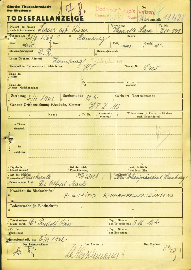 Lisser Henriette: Todesfallanzeige, Ghetto Theresienstadt