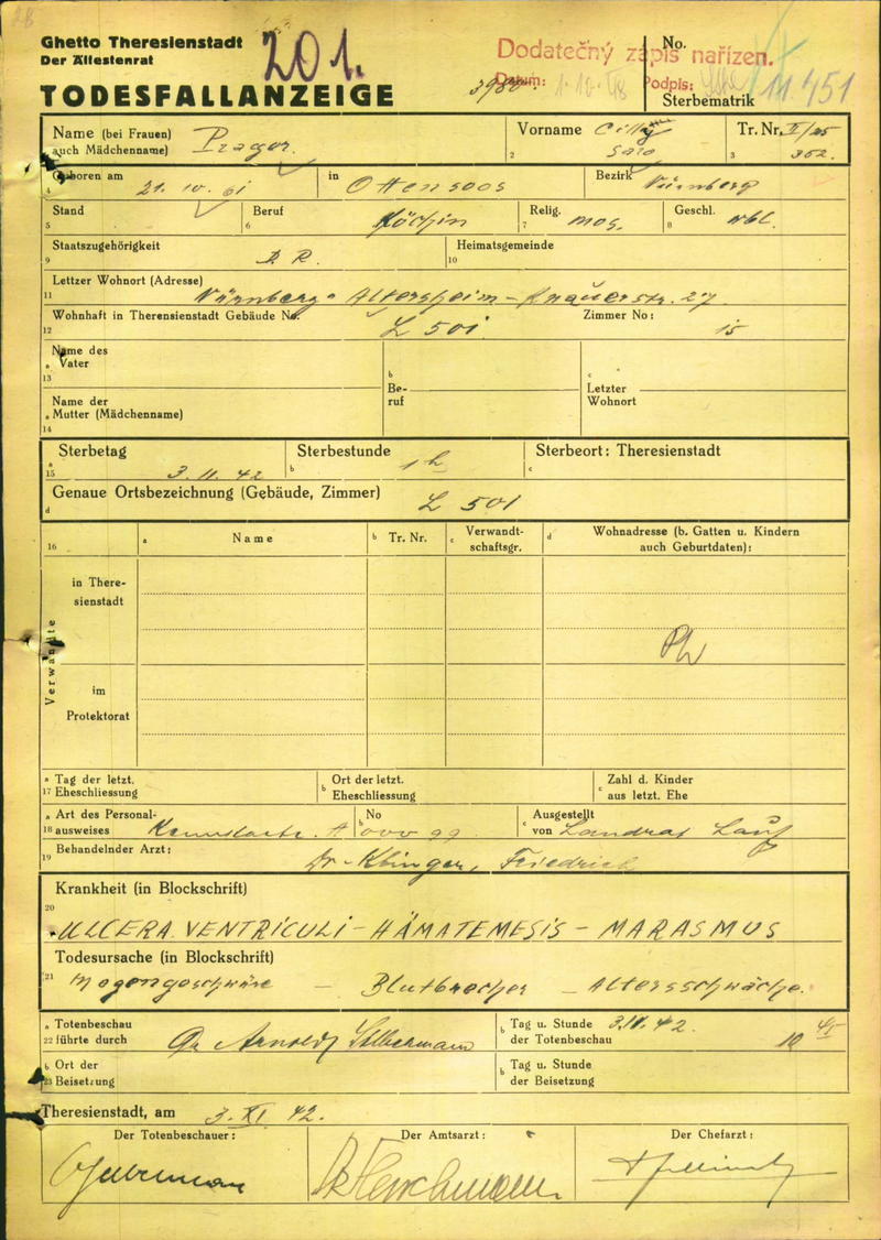 Prager Cilly: Todesfallanzeige, Ghetto Theresienstadt