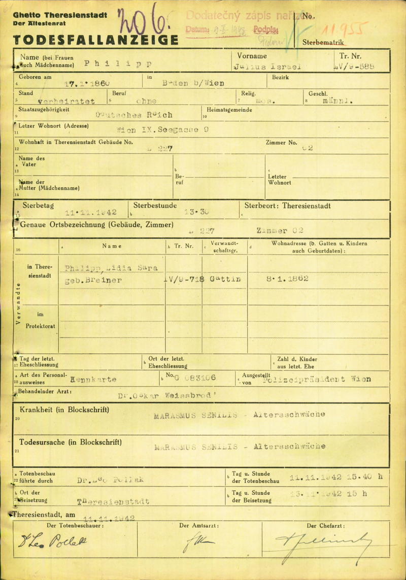 Philipp Julius: Todesfallanzeige, Ghetto Theresienstadt