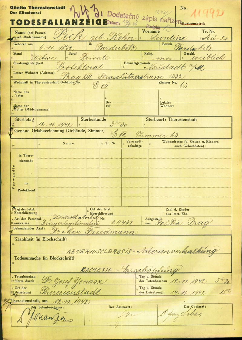 Picková Leontina: Todesfallanzeige, Ghetto Theresienstadt