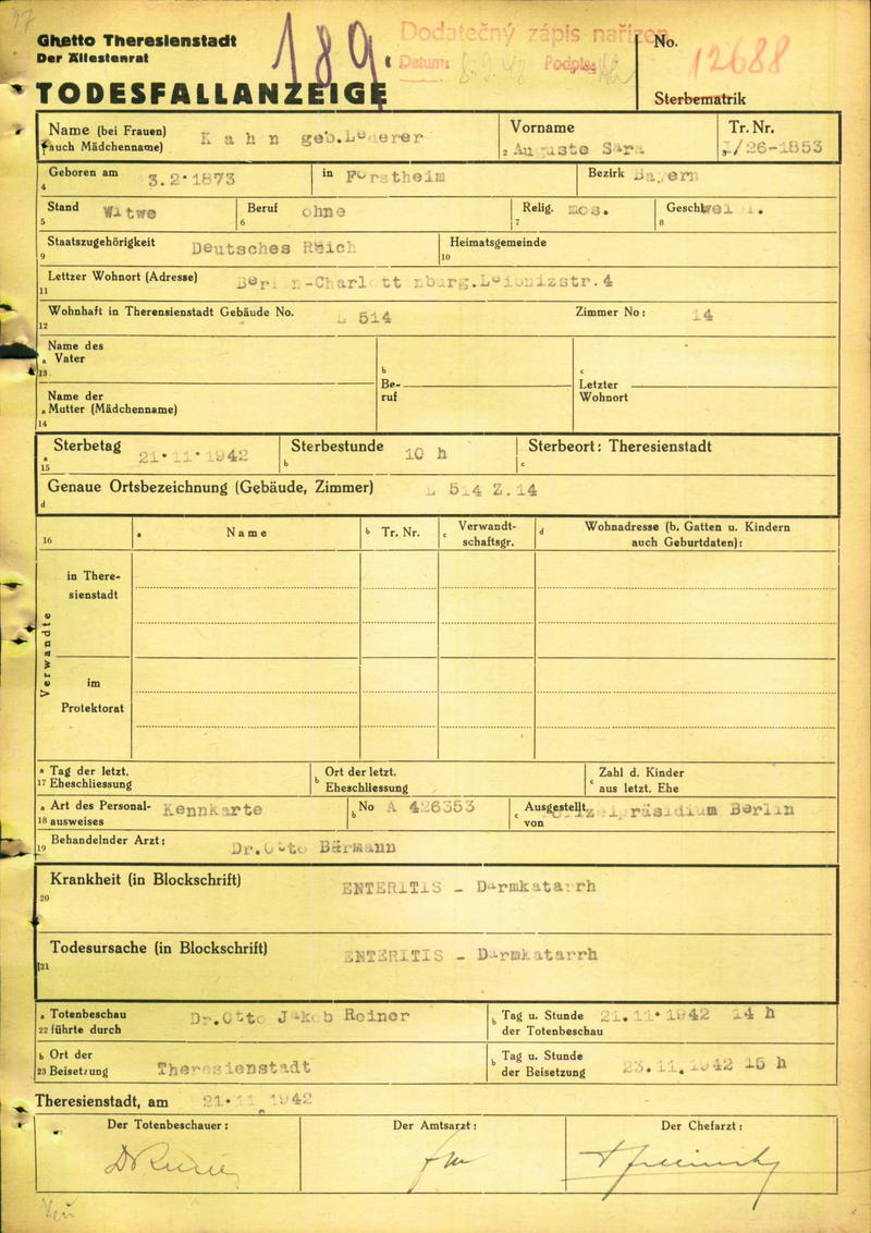 Kahn Auguste: Todesfallanzeige, Ghetto Theresienstadt
