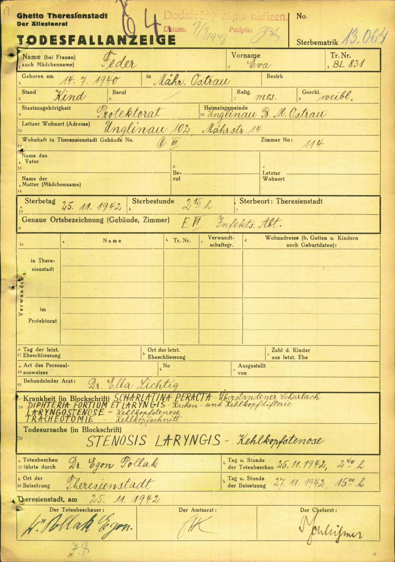 Federová Eva: Todesfallanzeige, Ghetto Theresienstadt