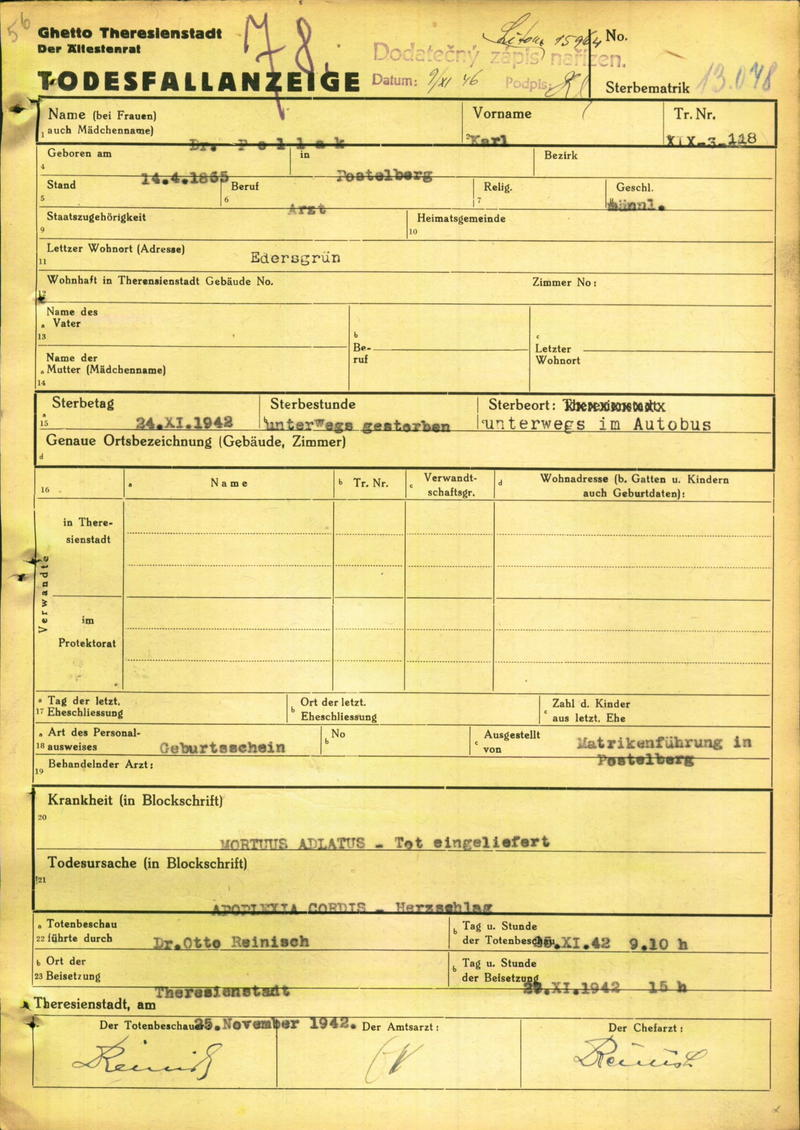 Pollak Karel: Todesfallanzeige, Ghetto Theresienstadt