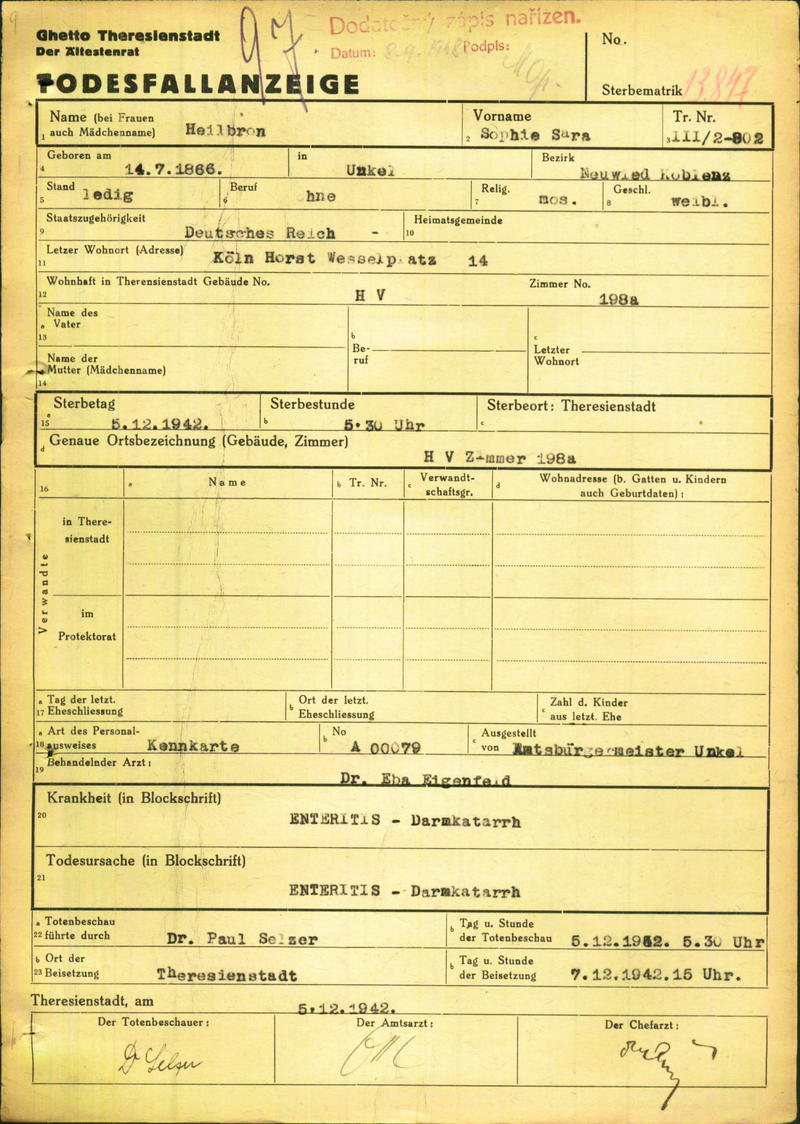 Heilbron Sofie: Todesfallanzeige, Ghetto Theresienstadt