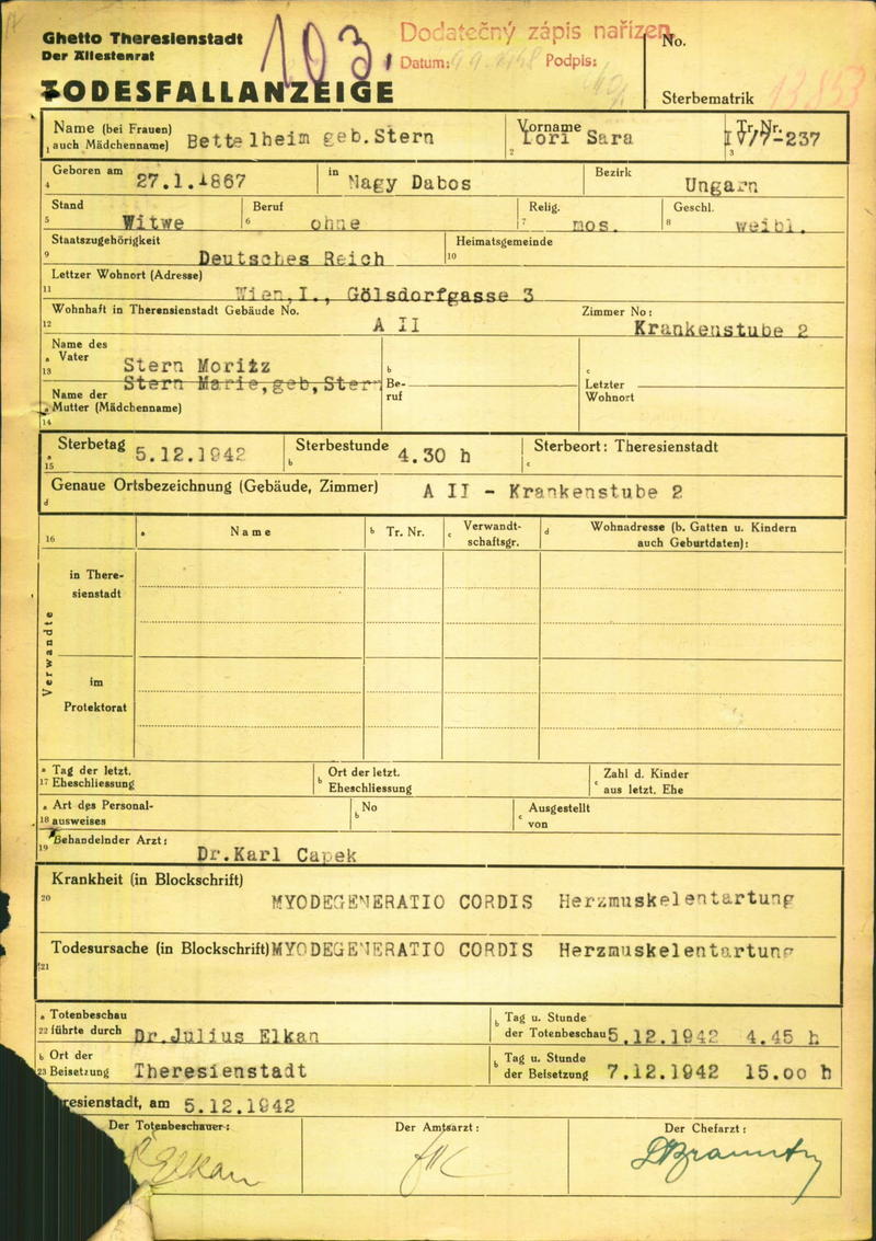 Bettelheim Lori: Todesfallanzeige, Ghetto Theresienstadt