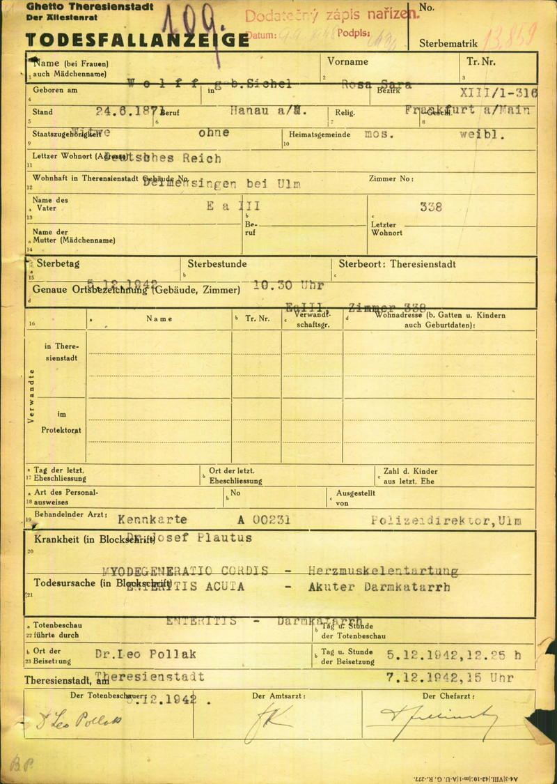 Wolff Rosa: Todesfallanzeige, Ghetto Theresienstadt