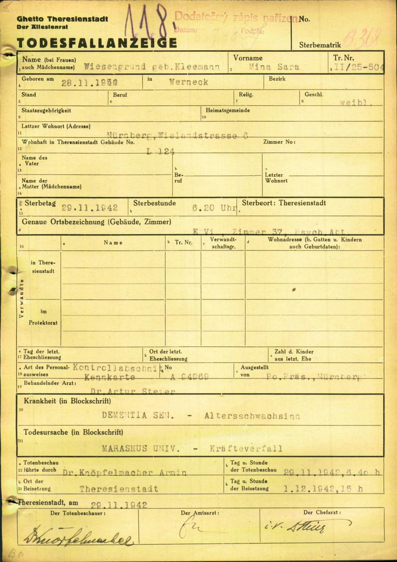 Wiesengrund Mina: Todesfallanzeige, Ghetto Theresienstadt