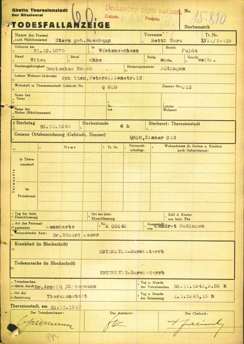 Stern Betty: Todesfallanzeige, Ghetto Theresienstadt
