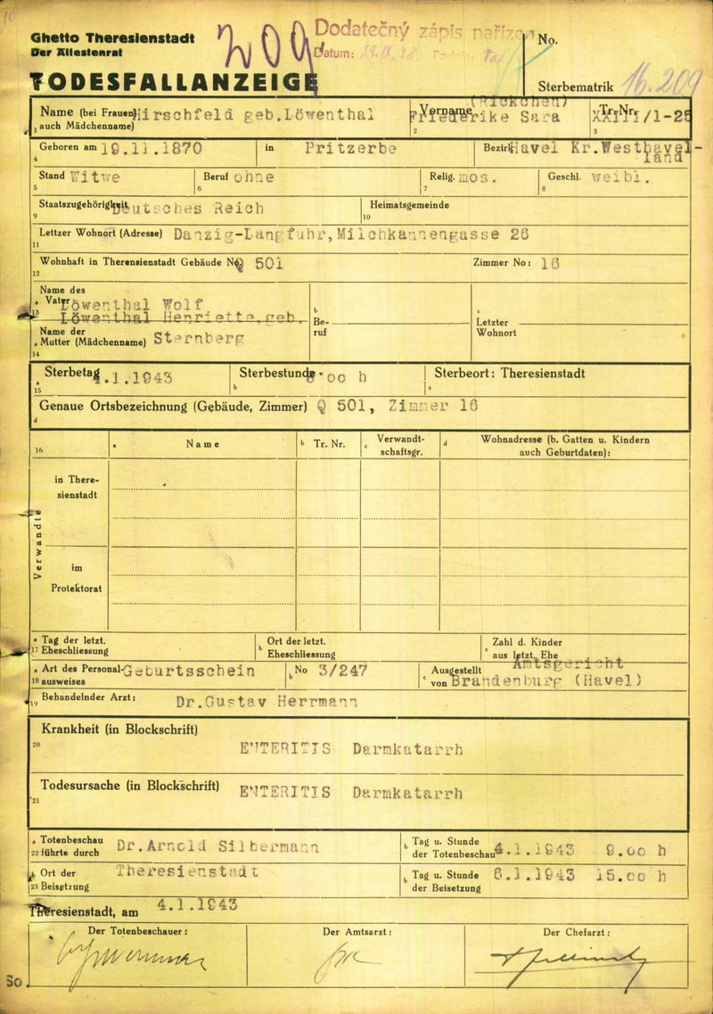 Hirschfeld Friederike: Todesfallanzeige, Ghetto Theresienstadt
