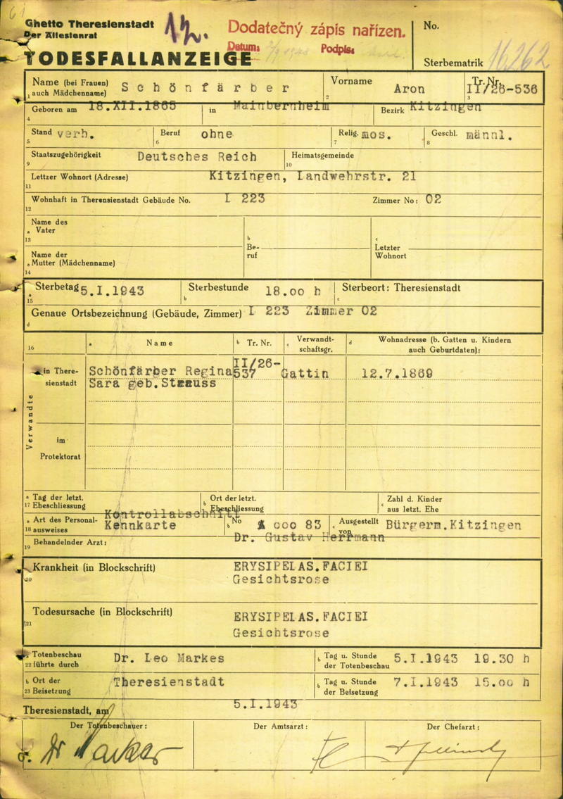 Schönfärber Aron: Todesfallanzeige, Ghetto Theresienstadt