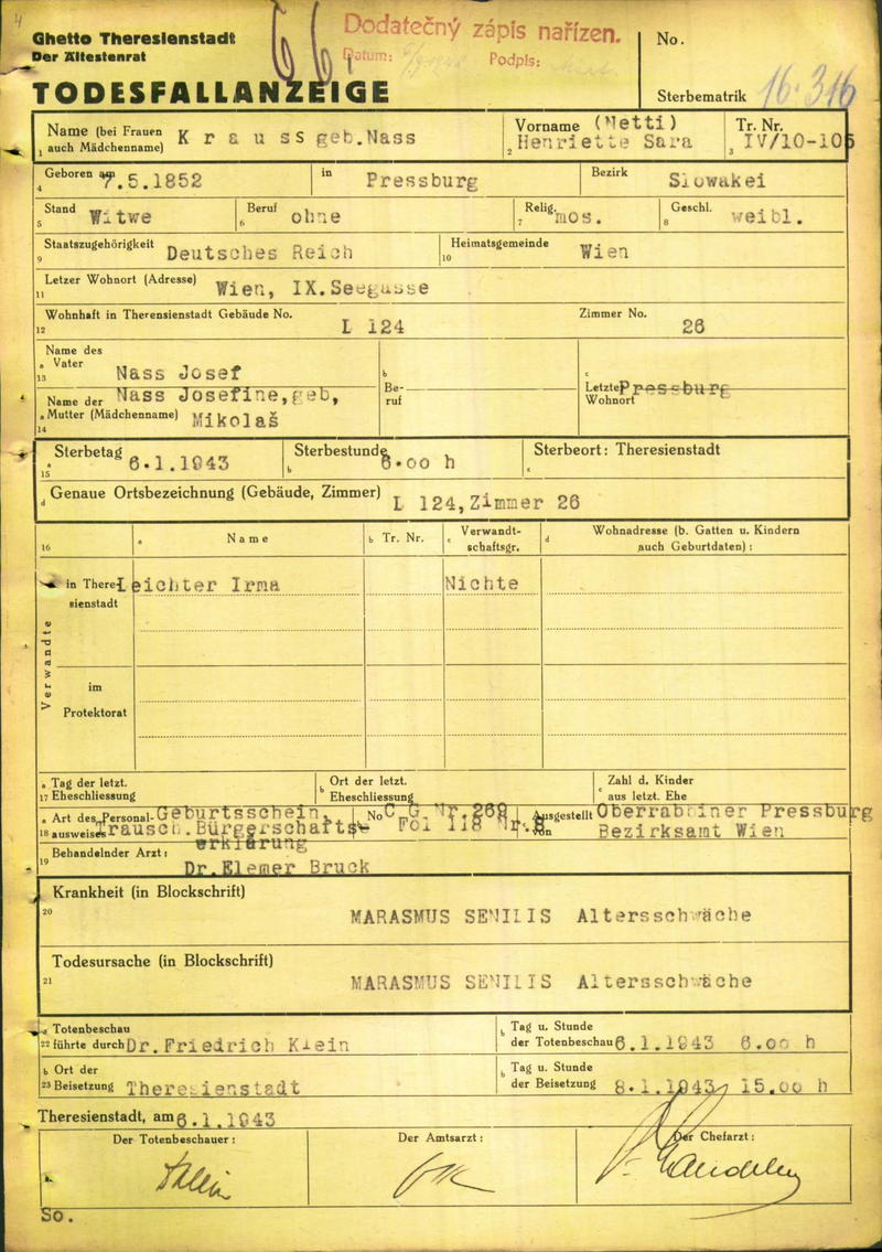 Krauss Henriette: Todesfallanzeige, Ghetto Theresienstadt