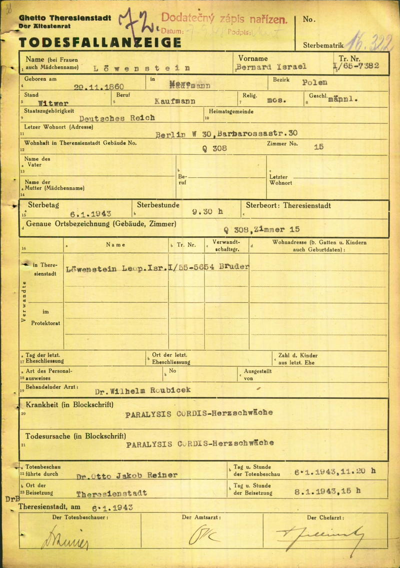 Löwenstein Bernhard: Todesfallanzeige, Ghetto Theresienstadt