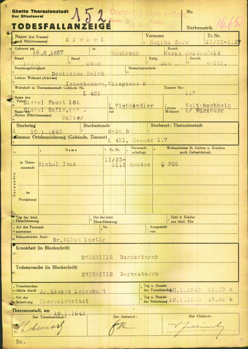 Sichel Regina: Todesfallanzeige, Ghetto Theresienstadt