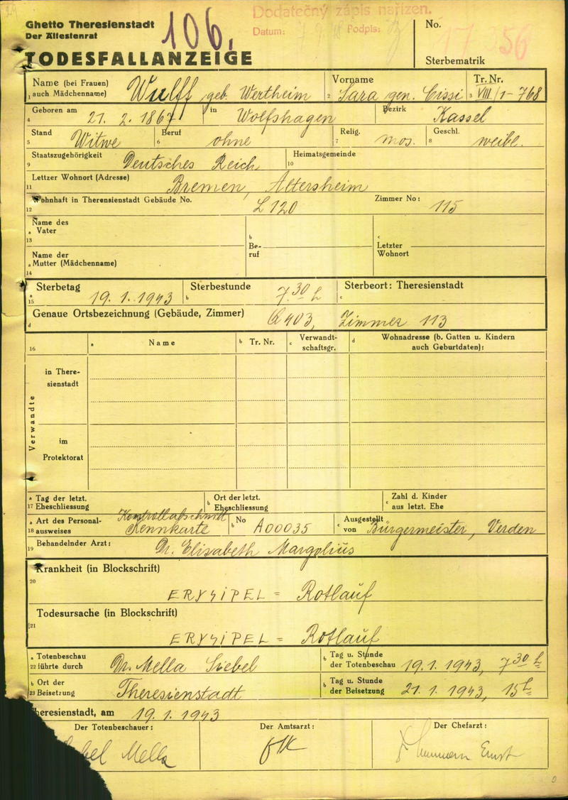 Wulff Cissy: Todesfallanzeige, Ghetto Theresienstadt