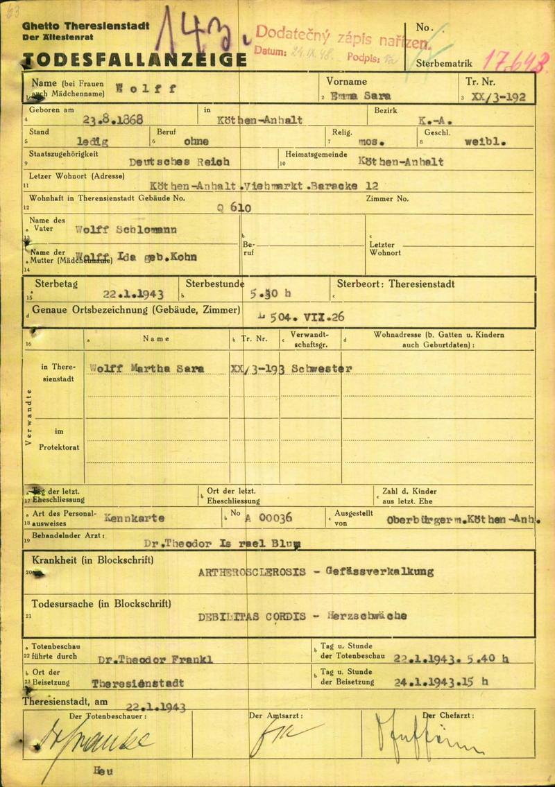 Wolff Emma: Todesfallanzeige, Ghetto Theresienstadt