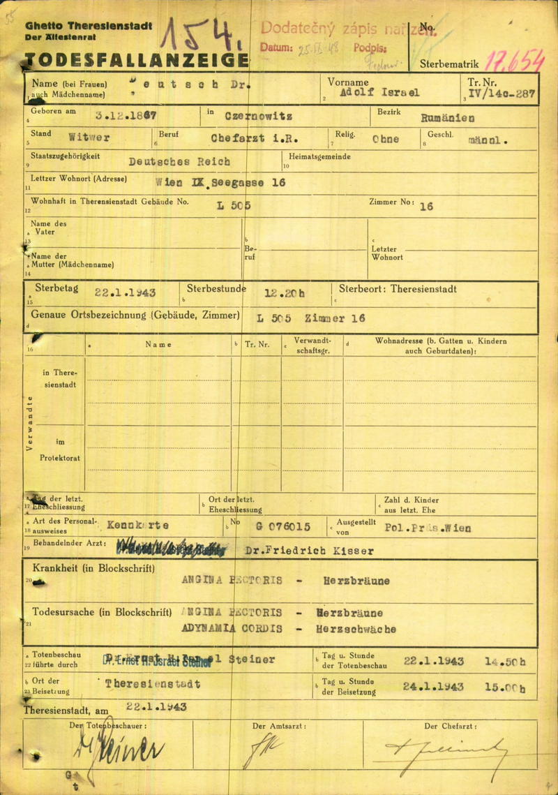 Deutsch Adolf: Todesfallanzeige, Ghetto Theresienstadt