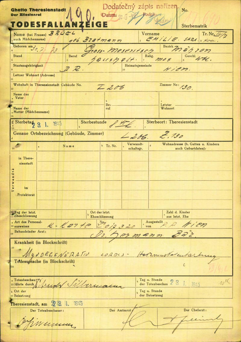 Brügl Emilie: Todesfallanzeige, Ghetto Theresienstadt