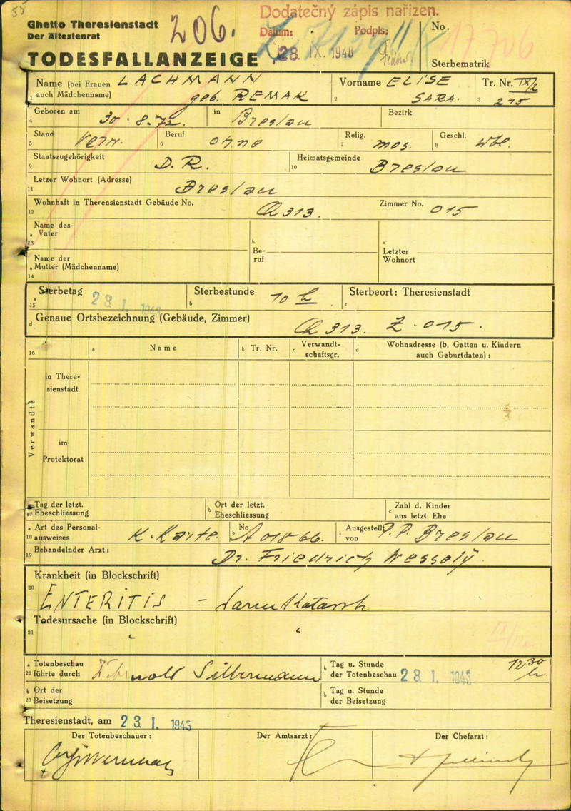 Lachmann Elise: Todesfallanzeige, Ghetto Theresienstadt