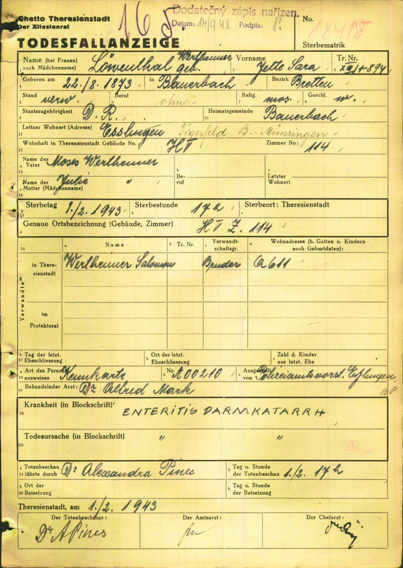 Löwenthal Jette: Todesfallanzeige, Ghetto Theresienstadt