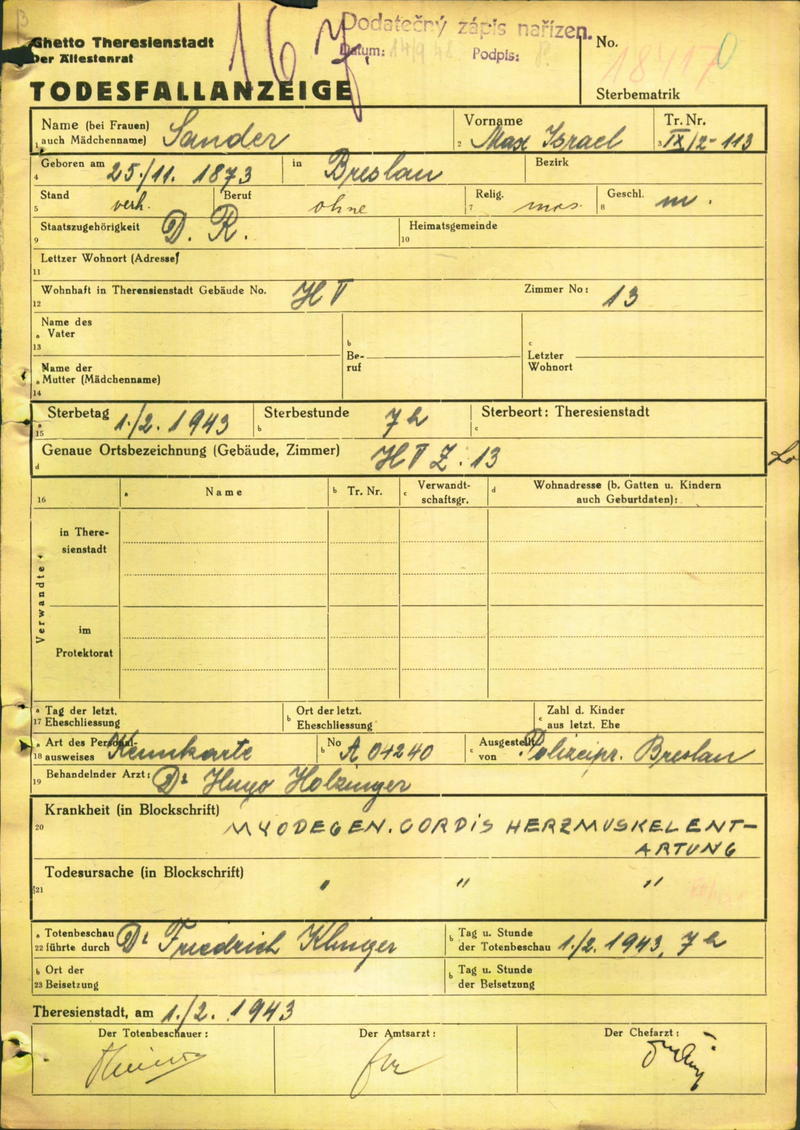 Sander Max: Todesfallanzeige, Ghetto Theresienstadt