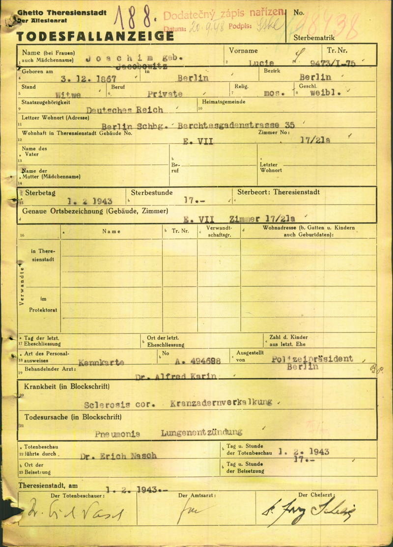 Joachim Lucie: Todesfallanzeige, Ghetto Theresienstadt