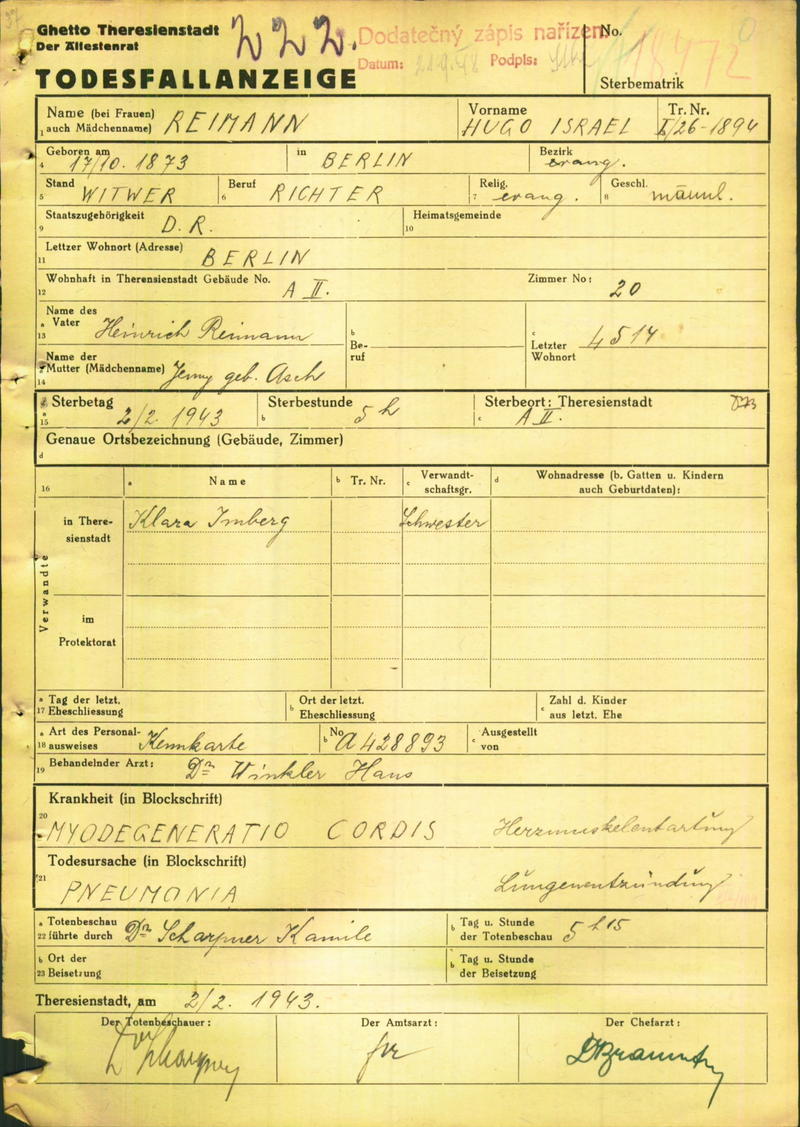 Reimann Hugo: Todesfallanzeige, Ghetto Theresienstadt