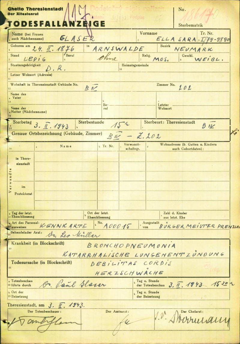 Glaser Ella: Todesfallanzeige, Ghetto Theresienstadt